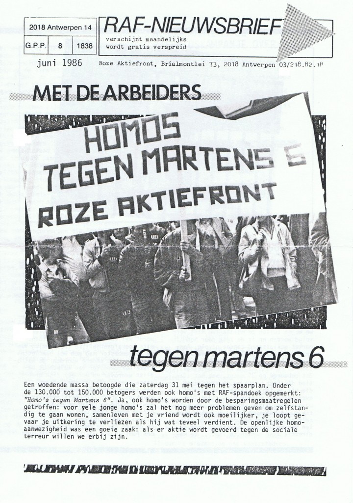 Mei 1986: Het Roze Aktiefront, dat intussen 5 jaar bestaat, publiceert voor het eerst een platform. Daarover schreef het RAF in een brochure naar aanleiding van het 10-jarig bestaan: “Het is het resultaat van veel discussiëren en plannen maken. We deden ook zo maar niet eender wat, de voorbije 5 jaar. Basis van ons werk is het RAF-platform. Dat is niet enkel bedoeld voor harde actievoerders, maar voor alle homo’s en lesbiennes die verder kijken dan hun eigen leven en omgeving. De brochure met het RAF-platform draagt dus niet zonder reden de titel “Wat je als homo moet weten”.